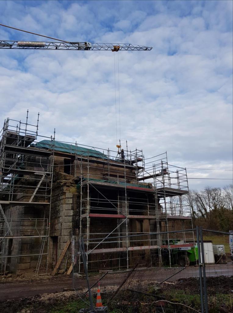 Les maçons travaillent sur le mur de refend intérieur pour les dernières consolidations. A cet emplacement se trouvait une ancienne cheminée. Sur les parties hautes surplombant la passage piéton des éléments de maçonnerie sont encore à changer.