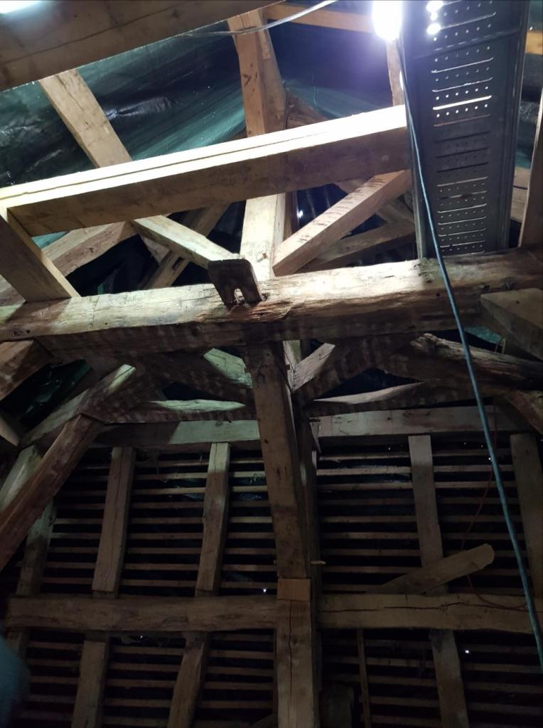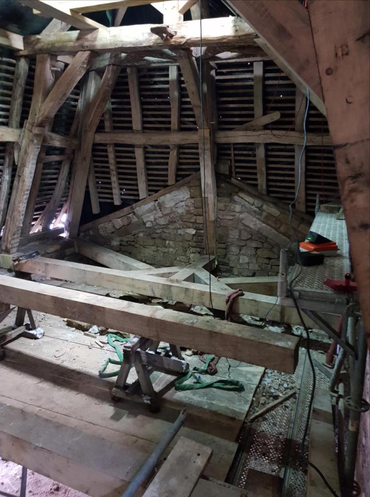 Les charpentiers travaillent à l’intérieur et mettent en œuvre des grosses poutres en réalisant des tenons, des mortaises et en chevillant l’ensemble. L’ensemble rigidifie et consolide la structure de la porterie et sa charpente.