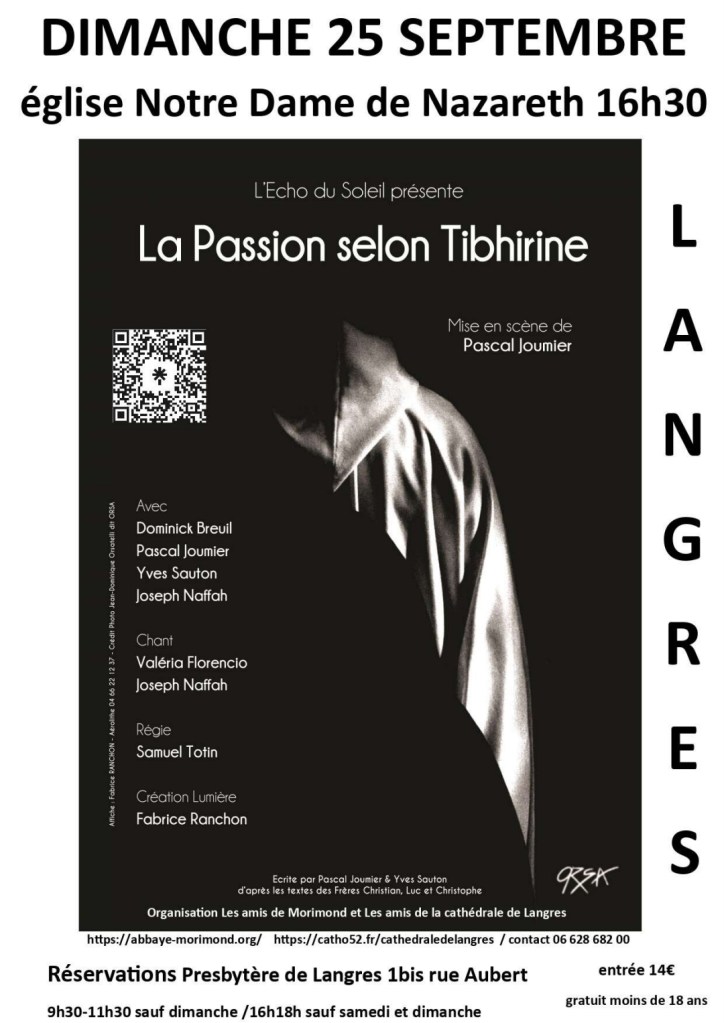 L’Association des Amis de Morimond et l’Association des Amis de la cathédrale de Langres organisent conjointement une représentation de la pièce de théâtre : « La passion selon Tibhirine » , le dimanche 25 septembre 2022.