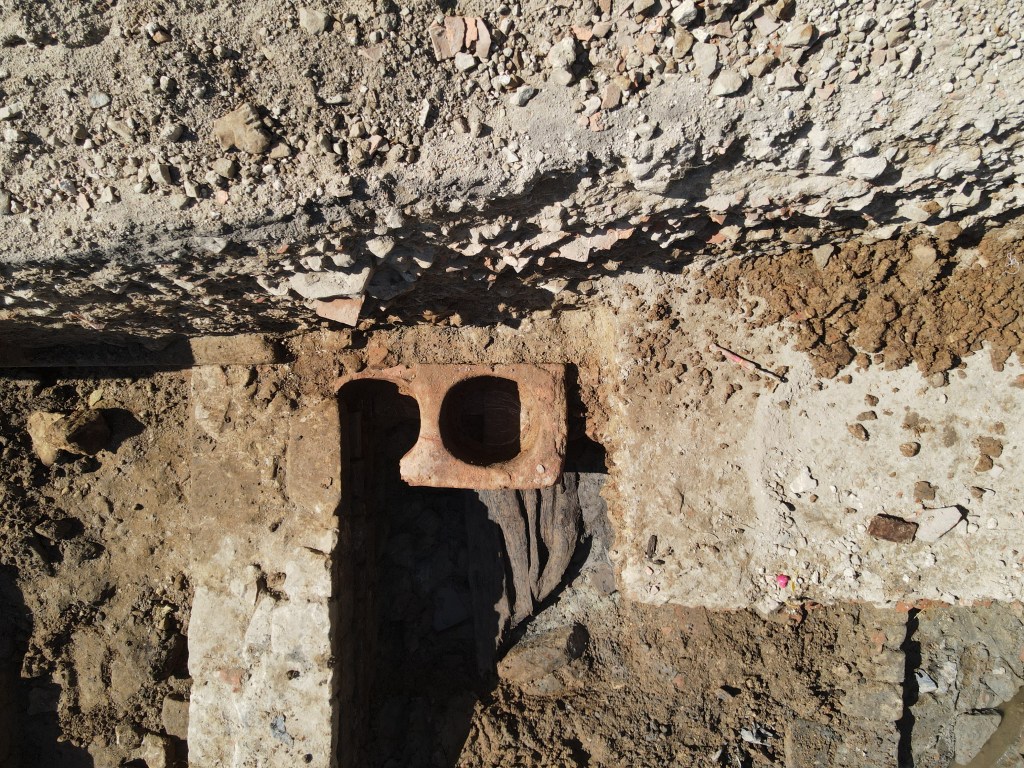 Fig. 4 : montant du drain en bois après démontage du linteau au niveau du bâtiment E.