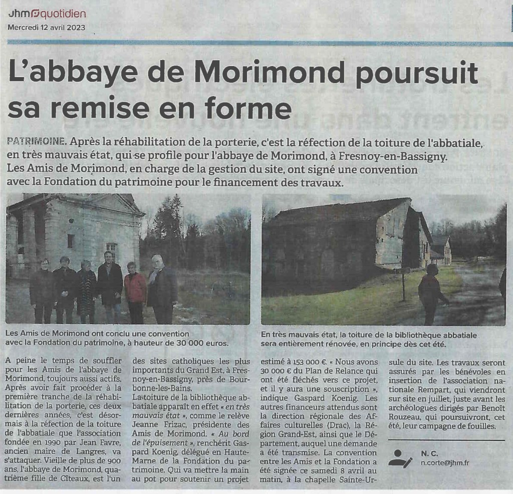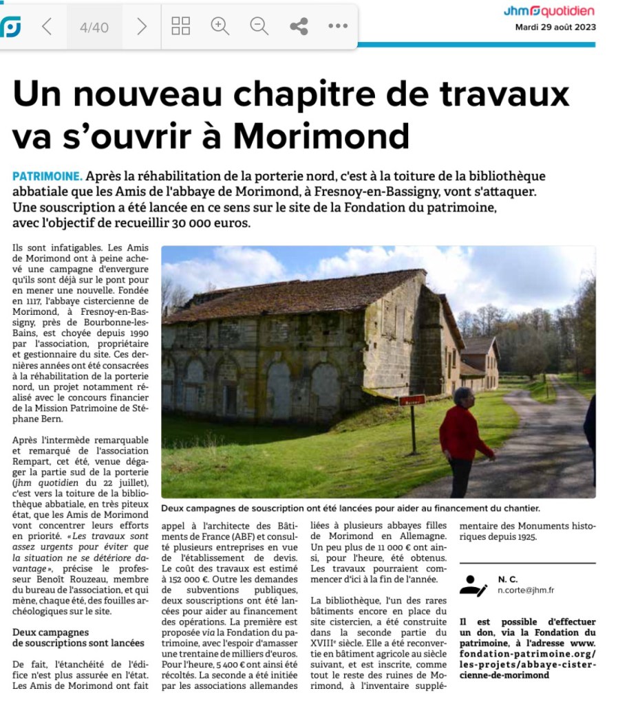 Pailles et foins sont stockés à l’étage et ont contribué à la sauvegarde du bâtiment. La couverture étant passablement fatiguée, mais la charpente encore solide, il était temps pour les Amis de Morimond de lancer un projet de restauration de cette toiture pour protéger le bâtiment en dessous. Deux articles du JHM écrits par Nicolas Corté témoignent de cette nouvelle aventure (fig. 5). Les Amis de Morimond doivent réunir un budget de 153 000 euros pour ces travaux. N’hésitez pas à soutenir cette initiative en allant sur le site de la fondation du patrimoine.