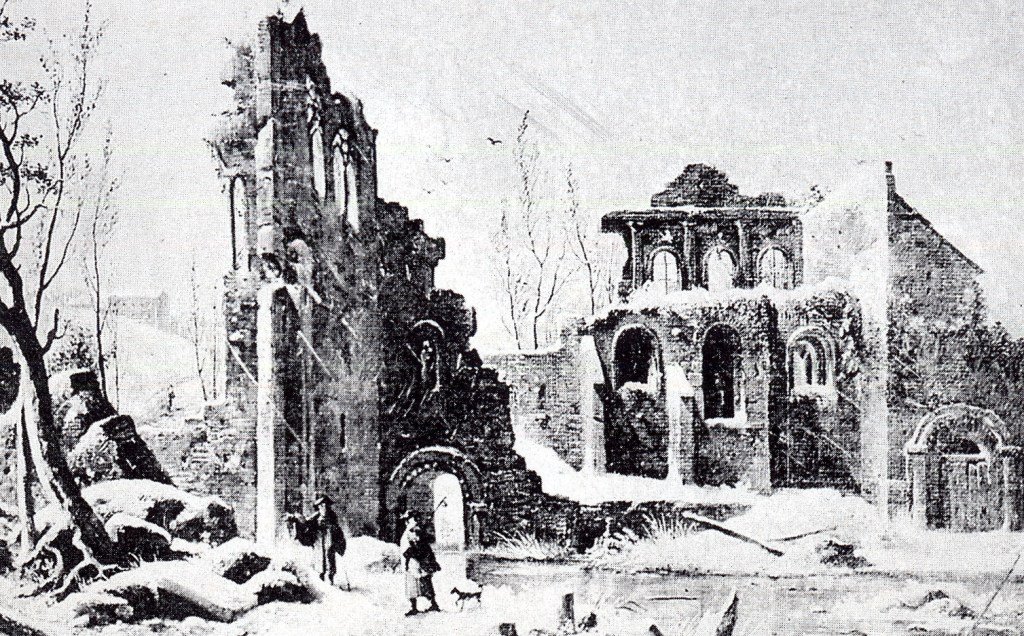 Fig. 4 : Lithographie de Pernot (1816-1817) qui montre la Bibliothèque à droite de l’image avec sa porte de communication au rez-de-chaussée avec la galerie occidentale du cloître. Le toit est déjà rabaissé comme aujourd’hui.